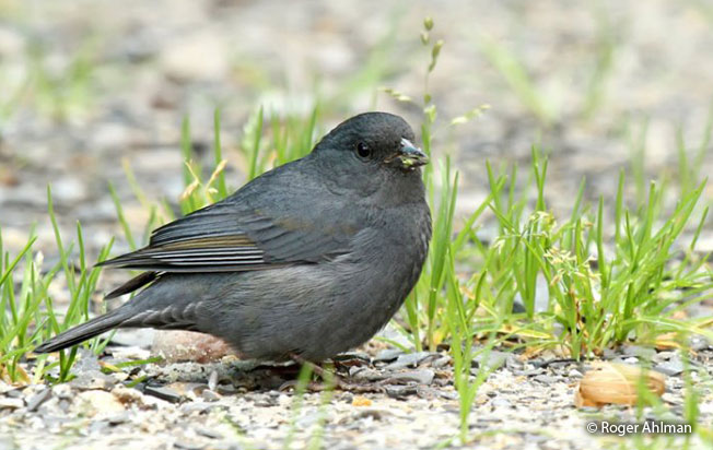Identification & Behavior: ~12.5 (5 in). The male Slaty Finch is all lead gray. The female is dark brown to olive-brown. Both sexes have conical and pointy bills. It forages in the understory of forest edges and appears to be associated with bamboo seeding events where it congregates. It is similar to the Plumbeous Sierra-Finch but it is distinguished by a smaller size and by using vary different habitats. Plumbeous Sierrra-Finches inhabitat open country scrub at high elevations in the Andes.